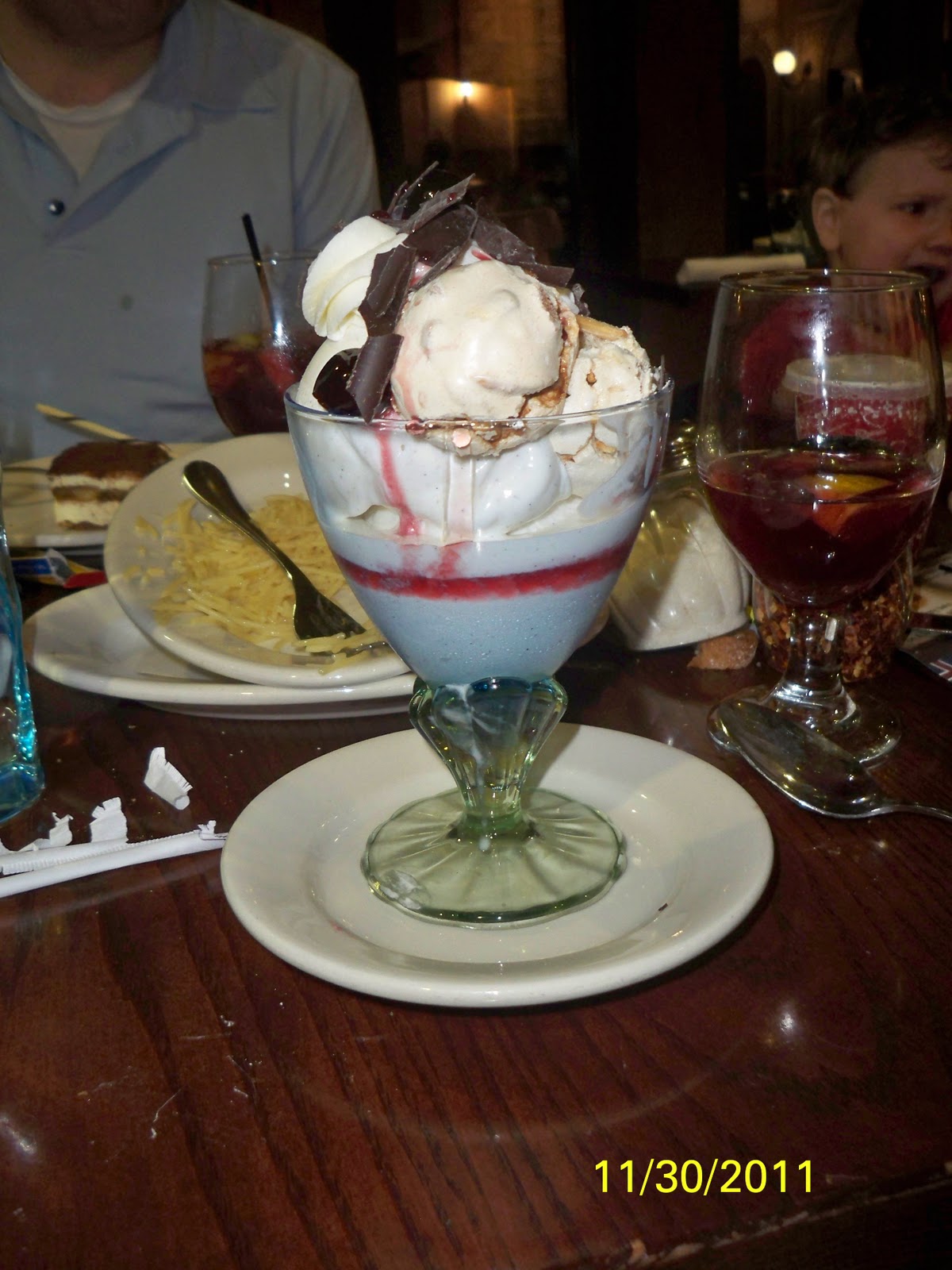 With the exception of some complaints from Ally that it was cold, all went well and we were seated at Via Napoli about 5 minutes after arriving. I don't recall if we were early or right on time for our reservation. This restaurant is a show piece at the back of the Italy pavilion! Absolutely beautiful. It's in a very large building that looks as though it were transplanted right out of Italy...not that I've ever been but still. ;-) Our table was in the area of the restaurant that can be opened for outdoor dining so it was a long line of sliding glass doors with a view of the pavilion courtyard. We immediately ordered a pitcher of sangria and decided on the calamari for an appetizer and a shared entree of their version of white lasagna with spinach. The kids stuck with a buttered spaghetti and bread with olive oil. Our food arrived at appropriate times and the portion sizes were perfect for us. The dessert choices were great and Ryan and I each had a treat; Ryan the tiramisu and I a vanilla ice cream sundae with ammaretti cookies and cherries with whipped cream. Oh. My. Gah. This dessert is worth going to the restaurant and I WILL go back for that alone (though the rest of our food was also very good)! Ryan said his tiramisu was really good too. The sangria was tasty but maybe just a bit sweet for my taste. I would've preferred it made with a dryer red wine I think.